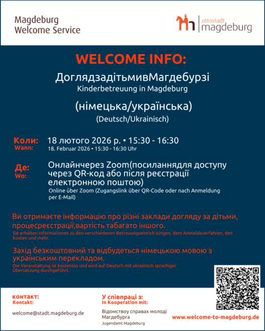 Learn more about the different types of childcare, the registration process for childcare, and the benefits of daycare for your children. A representative from the Magdeburg Youth Welfare Office will be available to answer all your questions after the presentation. The event will be accompanied by a Ukrainian-speaking interpreter.